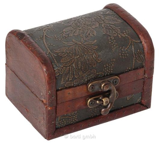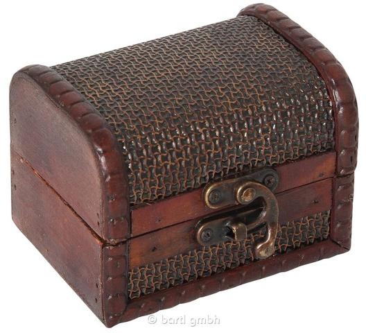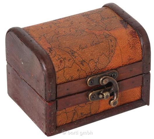Die Truhe (10 × 8 × 7,5 cm) ist mit feinem Stoff bezogen und kann unterschiedliche Muster haben - jede Truhe ist damit ein Unikat. Auch der Inhalt ist eine zufällige Auswahl, sodass bei jeder Bestellung eine andere Kombination von Puzzles möglich ist. Das Produktfoto zeigt daher nur ein Beispiel.