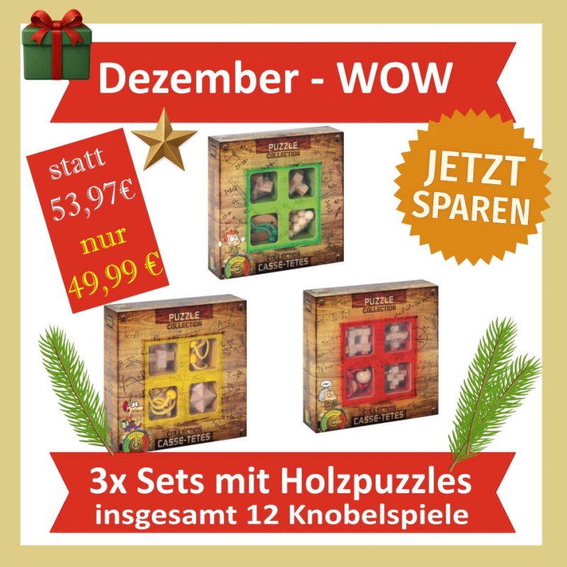 Dieses exklusive Vorteilspack enthält gleich drei komplette Sets der beliebten Wooden Puzzles Collection. Insgesamt warten 12 hochwertige Holz-Knobelspiele auf Euch, verteilt auf drei verschiedene Schwierigkeitsgrade (Junior, Expert, Extreme). Damit habt Ihr die Wahl: ein großes Geschenk oder drei einzelne Päckchen – perfekt für Weihnachten, Geburtstage oder als originelle Rätselabende.