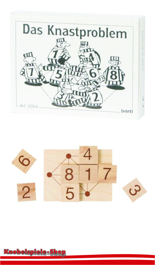 Aufgabe:Ersinnen Sie eine Platzordnung, bei der sich keine benachbarten Nummern berühren!Geschichte zum Mini-Knobelspiel:Beim Essen in der Gefängniskantine gab es immer Streit zwischen acht Häftlingen. Seltsamerweise zankten sich nur Sträflinge mit aufeinanderfolgenden Nummern. Damit der Gefängnisdirektor wieder in Ruhe sein Mittagessen genießen konnte, erdachte er sich eine Platzordnung, bei der keine benachbarten Nummern nebeneinander sitzen – auch nicht diagonal! Versuchen Sie nun, diese Sitzordnung auf dem beiliegenden Spielfeld nachzulegen!Weitere Bilder: