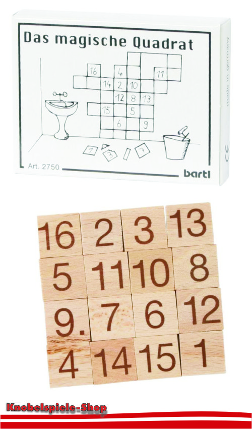Aufgabe:Versuchen Sie, die 16 Zahlen-Plättchen so anzuordnen, das die Summe jeder Spalte, Reihe und Diagonalen jeweils die gleiche Zahl ergibt.Geschichte zum Mini-Knobelspiel:Als der junge Mathematik-Professor sein Bad renovieren ließ, wählte er dafür Fliesen mit verschiedenen aufgemalten Zahlen. Da die Arbeit nicht sehr anspruchsvoll erschien, wurde sie dem neuen Lehrling übertragen. Nach der Fertigstellung war der Professor jedoch total begeistert. – Der Junge hatte die Fliesen so angeordnet, dass sich lauter “magische Quadrate” ergaben. Welche Leistung dies war, werden Sie merken, wenn Sie sich selber an diesem Knobelspiel versuchen.Weitere Bilder: