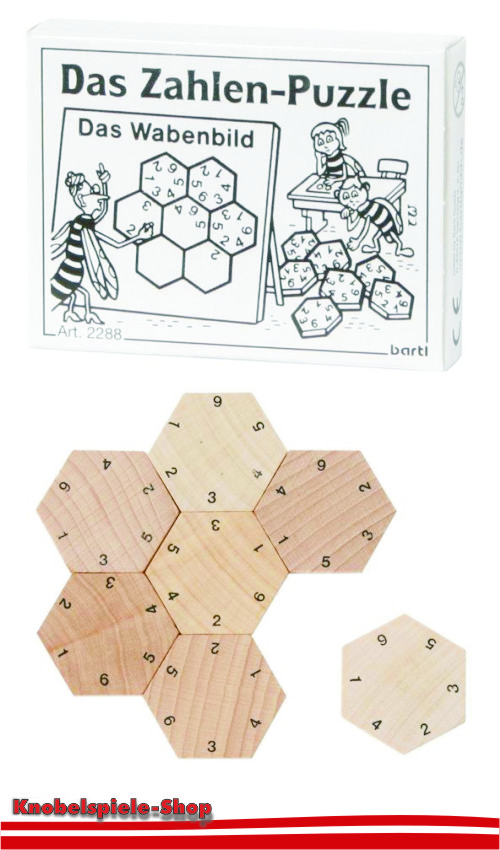 Aufgabe:Ordnen Sie sechs Waben im Kreis um eine siebte Wabe an! Dabei dürfen nur gleiche Zahlen aneinander stoßen.Geschichte zum Mini-Knobelspiel:Die Lehrerin einer kleinen Biene hatte sich für die Abschlussprüfung im Fach Wabenbau etwas ganz Besonderes einfallen lassen. Sieben Waben waren jeweils mit den Zahlen von 1 bis 6 beschriftet. Angeblich sollte es möglich sein, sechs dieser Waben so um die siebte anzuordnen, dass nur gleiche Zahlen aneinanderliegen. Falls Sie mit der Lösung Probleme haben, essen Sie mehr Honig oder fragen Sie eine “süße Biene” aus der Nachbarschaft!Weitere Bilder: