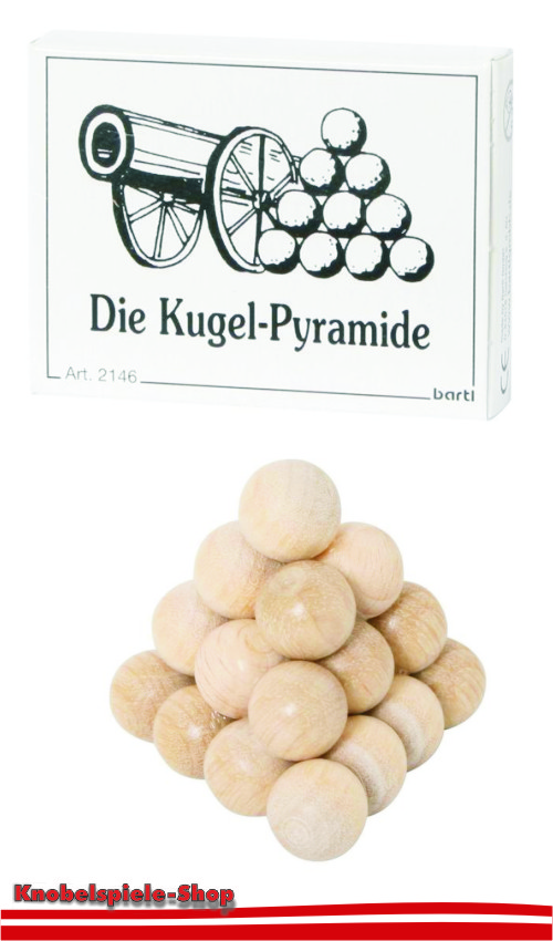 Aufgabe:Aus sechs “Kugel-Klumpen” müssen Sie die Kugel-Pyramide bauen!Geschichte zum Mini-Knobelspiel:Während des 30-jährigen Krieges erhielt eine kleine Festung an der Donau plötzlich die Nachricht, dass ein Inspektionsbesuch des großen Feldherren Eusebius von Wallenstein unmittelbar bevorstehe. Man geriet sofort in Hektik, denn Wallenstein war nicht nur streng, sondern geradezu pingelig. Eine seiner Lieblingsvorschriften besagte, dass neben jeder Kanone ein sauberer Kugelhaufen aus 20 Kanonenkugeln aufzurichten ist. Die Kanoniere eilten in die Magazine und schleppten ihre Kugeln auf den Hof. Unglücklicherweise waren in dem bekanntlich sehr feuchten Herbst 1621 jeweils mehrere Kugeln zu unförmigen Klumpen zusammengerostet. Dennoch gelang es ihnen, aus zum Beispiel sechs Kugel-Klumpen die geforderte Pyramide zu errichten. Sollten Sie länger als 2 Stunden für die gleiche Arbeit benötigen, ist zu befürchten, dass Sie in der damaligen Zeit nicht als Kanonier sondern als Kanonenfutter Verwendung gefunden hätten…Weitere Bilder: