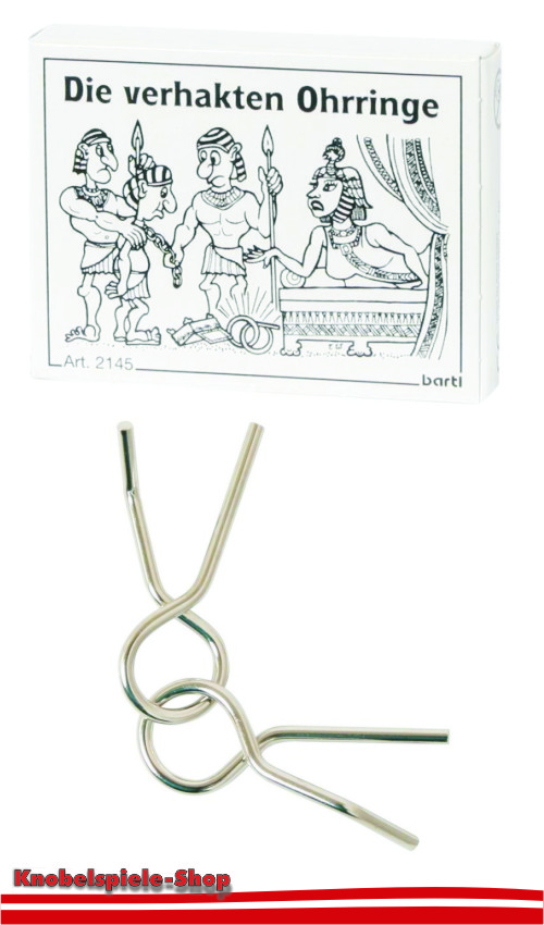 Aufgabe:Trennen Sie die beiden Metall-Teile voneinander und fügen Sie sie anschließend wieder zusammen.Geschichte zum Mini-Knobelspiel:Der Juwelier der Königin Cloepatra musste jeden Tag ein paar neue Ohrringe präsentieren. Einmal entglitt ihm die Schatulle und die Ohrringe verhakten so unglücklich ineinander, dass er sie nicht mehr voneinander lösen konnte. Die erboste Königin befahl, ihn so lange einzusperren, bis er die Schmuckstücke wieder getrennt hatte. Zwei Altertumsforscher fanden Jahre später sein Skelett! Sie können zur Erlösung seiner Seele beitragen, indem Sie seine Aufgabe vollenden – und zwar möglichst zu Ihren Lebzeiten!Weitere Bilder: